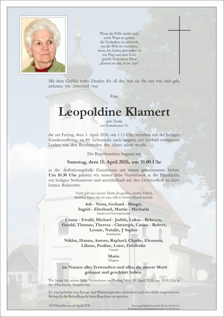 Traueranzeige – Leopoldine Klamert Schreibe einen Kommentar Antworten abbrechenDeine E-Mail-Adresse wird nicht veröffentlicht. Erforderliche Felder sind mit * markiertName * E-Mail * Website Kommentar * Meinen Namen, meine E-Mail-Adresse und meine Website in diesem Browser für die nächste Kommentierung speichern.